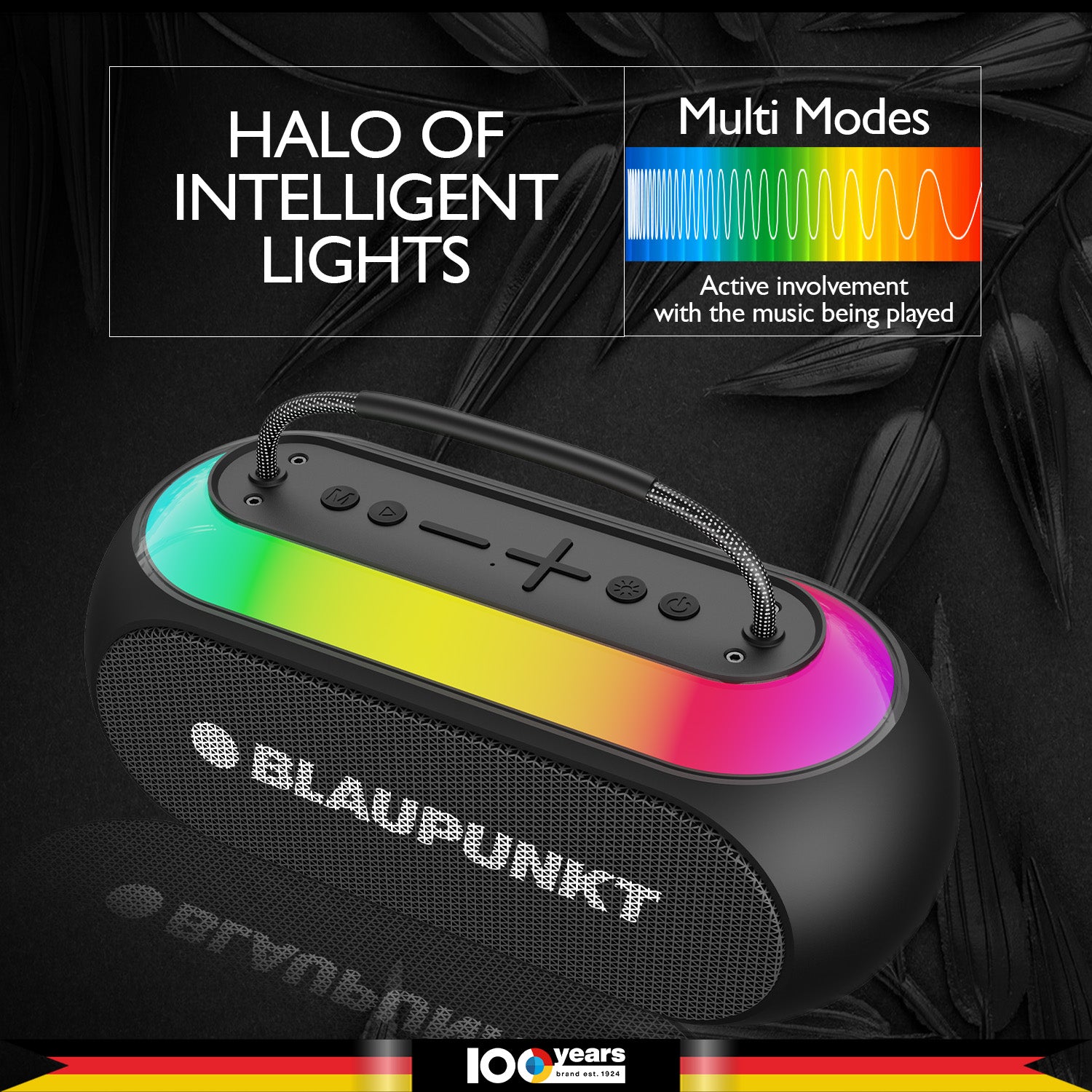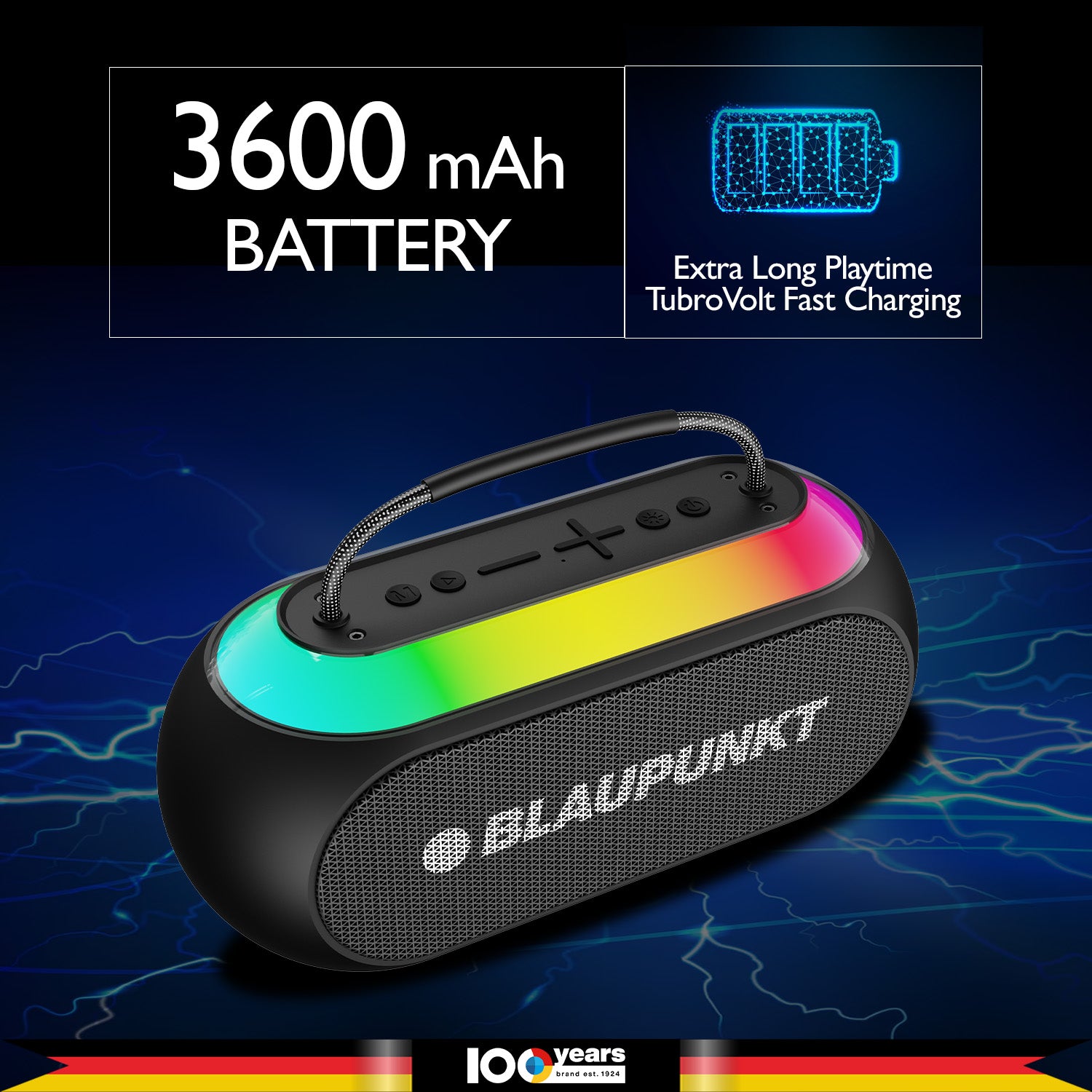 The Blaupunkt Atomik Kolors boombox reimagines portable audio. Its stylish, compact design features a durable metal grill, organic curves, a vibrant light ring, and a convenient rope handle. Experience powerful 35-watt Blaupunkt sound with rich bass, thanks to dual 2.5” speakers and a large passive radiator. Elevate your karaoke with the included premium MIC and unique EFF Voice Effects (Dude, Tough Guy, Female, Child) for perfect voice/music synchronization. Enjoy extended playtime with the high-efficiency 3600mAh battery and TurboVolt fast charging. Connectivity includes Bluetooth, USB, TF, TWS, Handsfree. Backed by over 100 years of audio innovation, Blaupunkt delivers unmatched quality and its signature sound.
