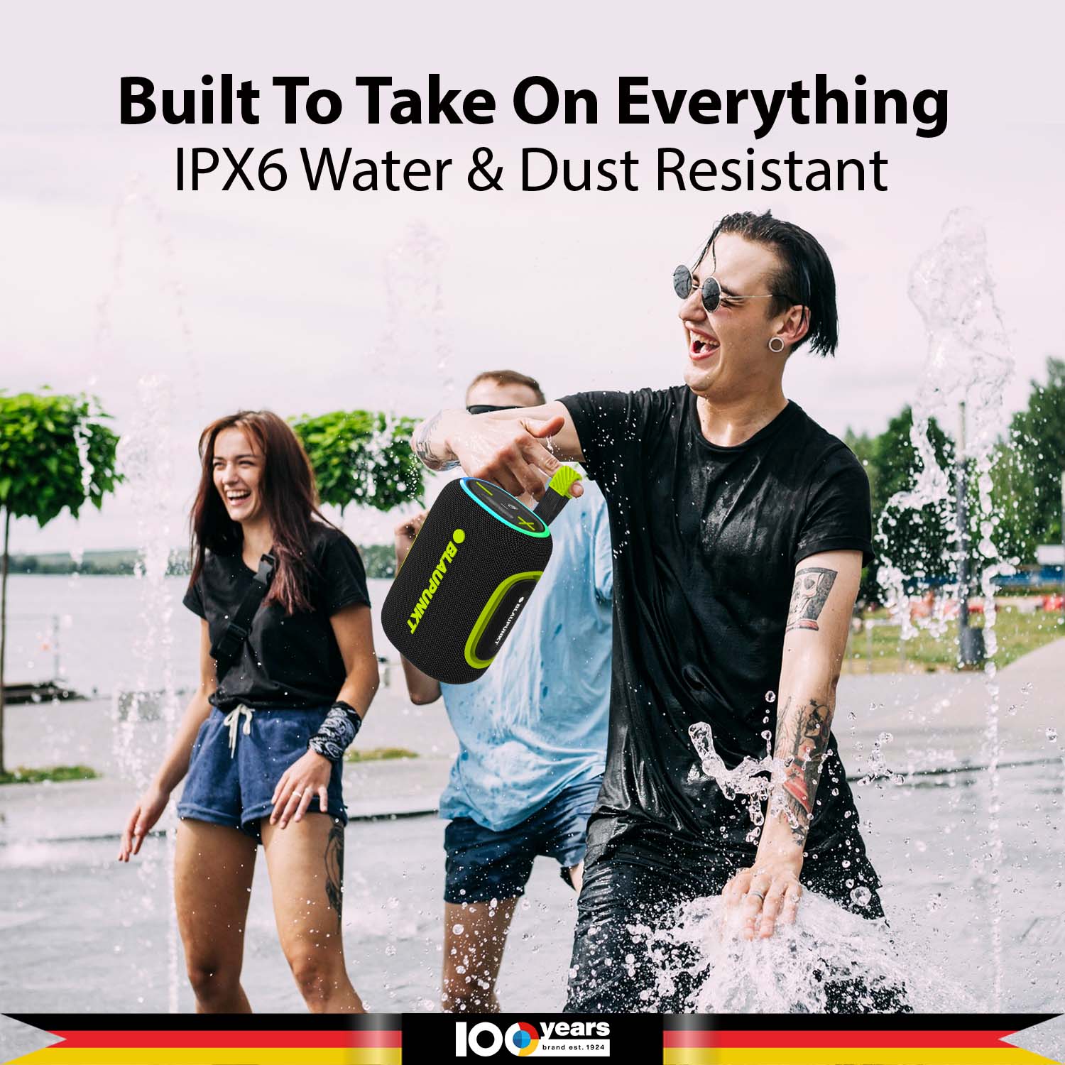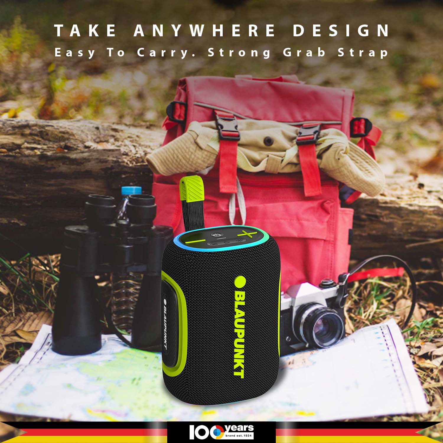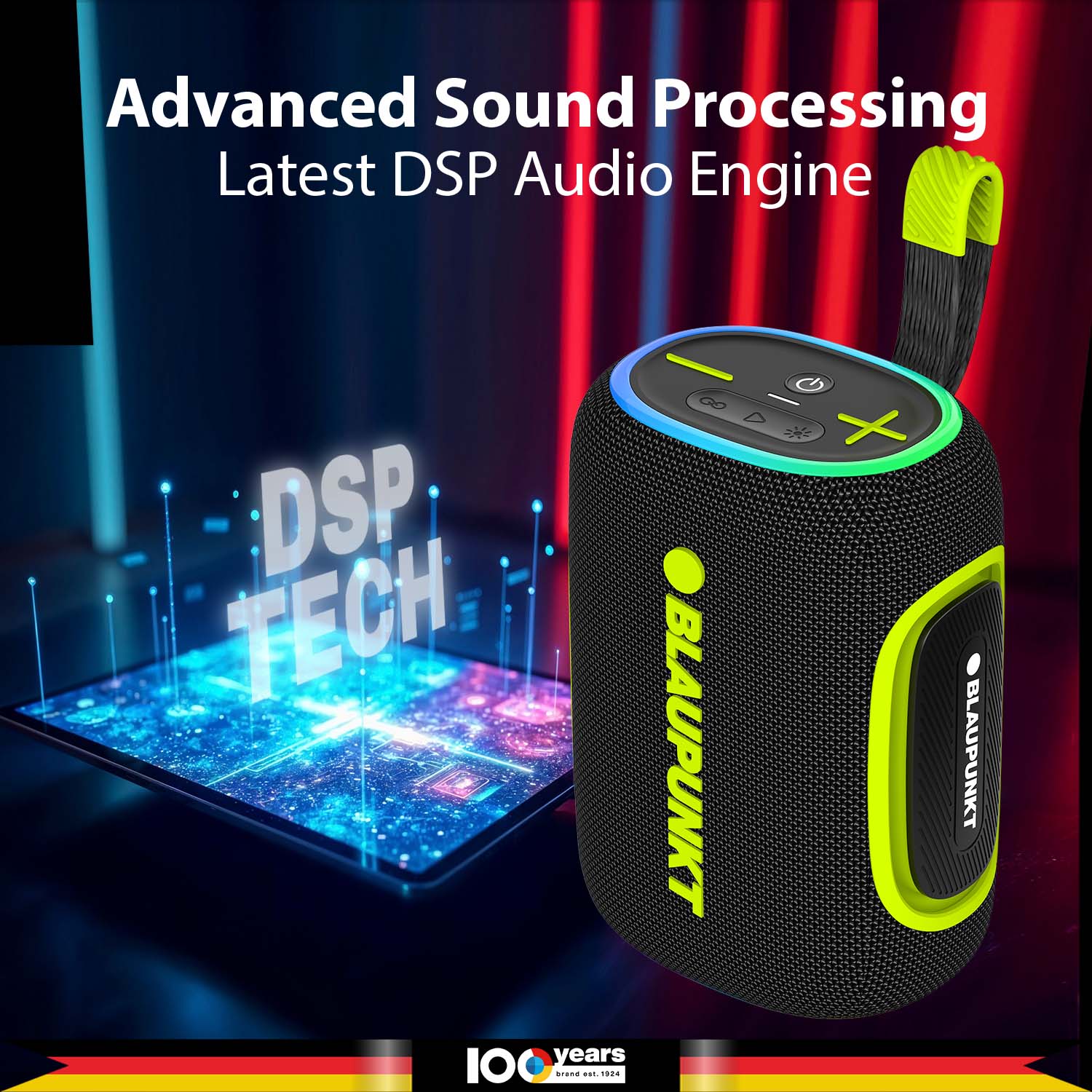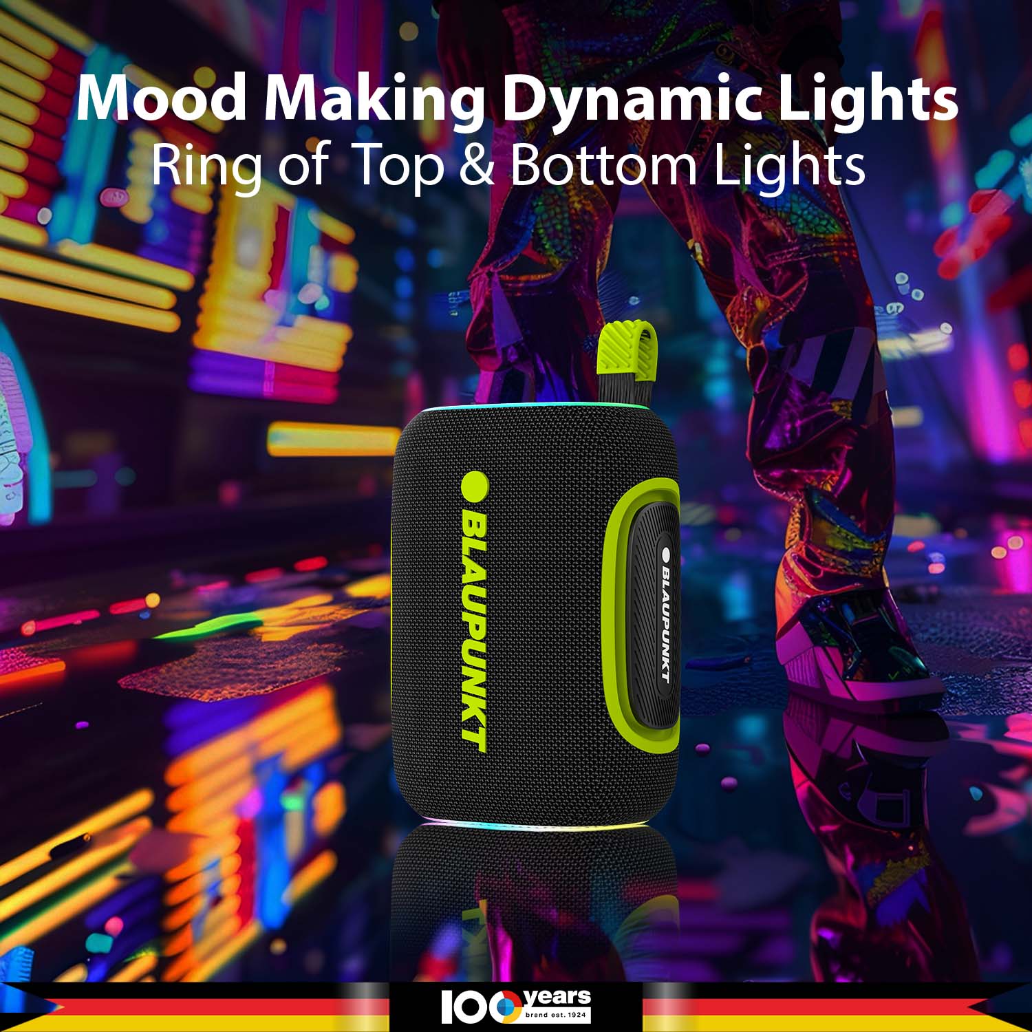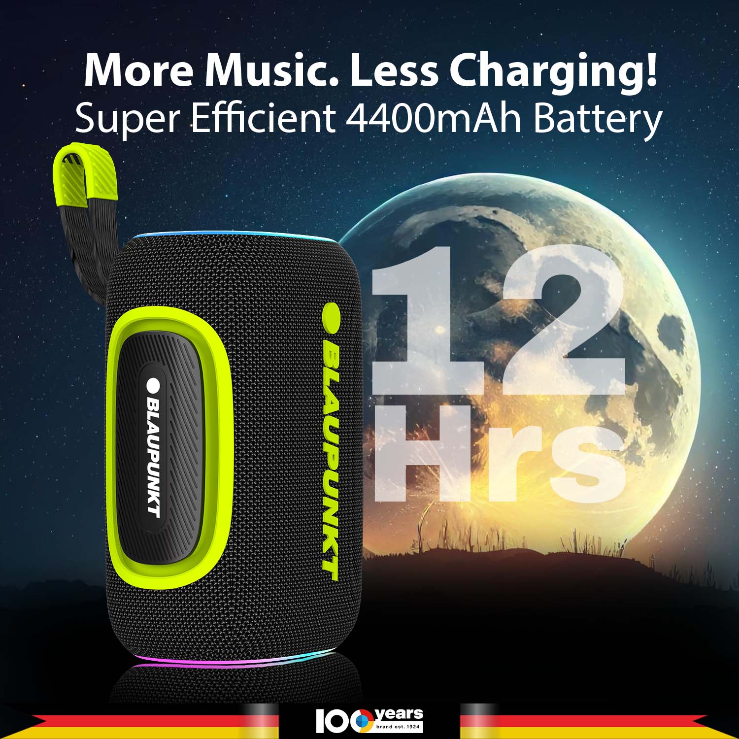 Blaupunkt’s portable speaker offers TECH & POWER with 60W of deep sound, two speakers, DSP precision, and dynamic LED lights. It runs on a 4400mAh battery, providing up to 12 hours of playtime. Its sleek design combines style and performance perfectly.