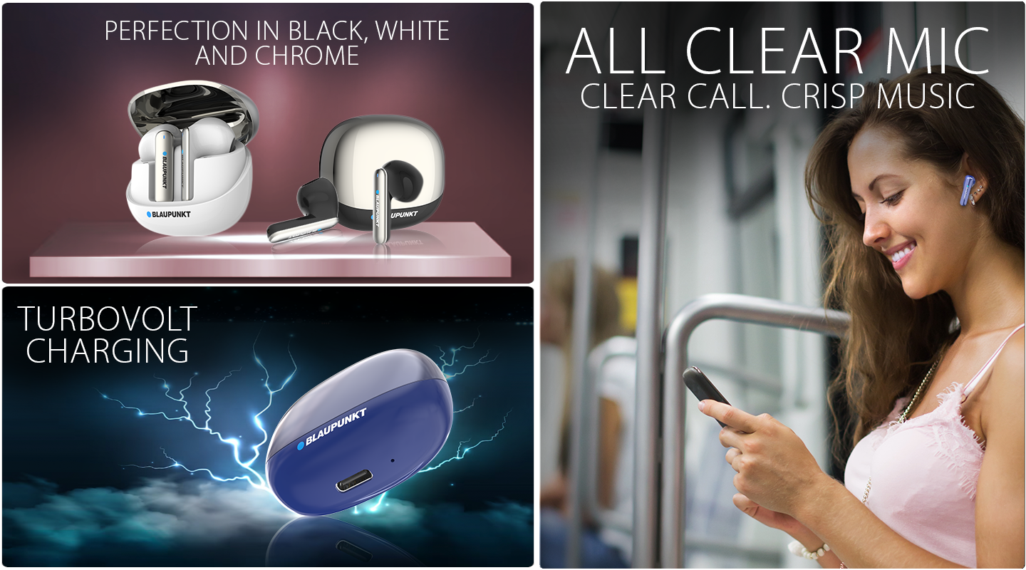 Blaupunkt BTW100 KHROME is here. Or It’s smooth. It’s shiny. It’s Khrome! Presenting the new BTW100 KHROME Blaupunkt has stepped out of its design philosophy and made a grand statement. The new BTW100 Khrome is unlike all the other excellent earbuds this iconic brand has given us. These come with a unique chrome finish that adds lots of panache. Inside these incredibly beautiful earbuds you will find the same audio technology that has made Blaupunkt famous around the world.the BTW100 Khrome comes with super-efficient batteries both in the case and the buds. These batteries are powerful and deliver 30 hours of playtime.The BTW100 Khrome is no different. They come with very sensitive Mics that process sound and deliver clear true audio.