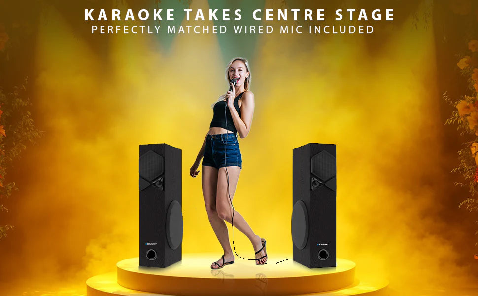 Blaupunkt ROCK & ROLL TSP Tower Speaker- Unleash the Power of Pure Sound. Turn up the energy with 160W RMS output and dual 8" subwoofers that deliver deep, room-shaking bass. Crisp highs flow through premium silk dome tweeters, while adjustable bass and treble controls let you fine-tune your vibe. Whether you're hosting a party or belting out karaoke hits, this wooden-built tower speaker brings rich acoustics and timeless style to any space.